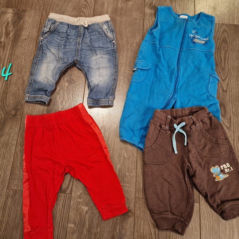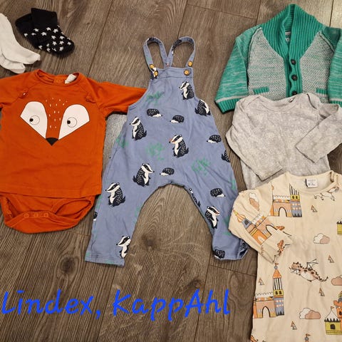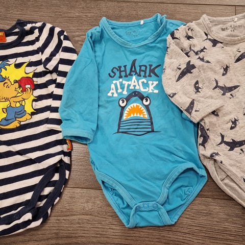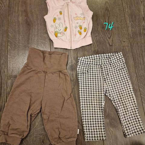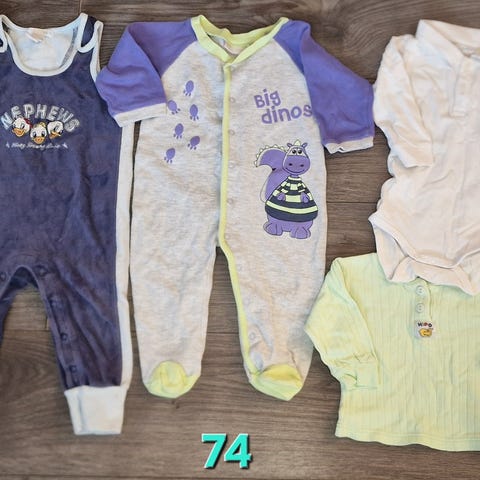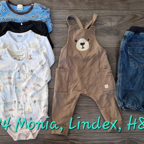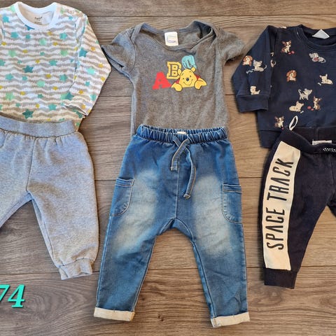 Vauvan vaatteet koossa 74. Merkkeinä MyWear, Name it, H&M. T-paita, housut, body, lyhythihainen body, yöhaalari.