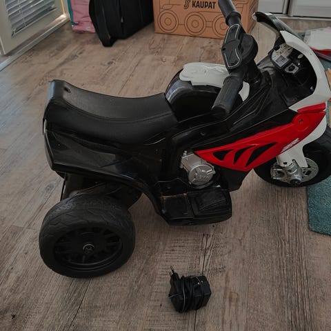 Mini Moto sähköinen lastenmopo, musta runko punaisilla yksityiskohdilla. Sopii lapsille, tarjoaa sähkömoottorilla toimivan ajokokemuksen. Kevyt ja kompakti koko, soveltuu ulkokäyttöön.