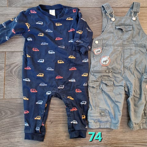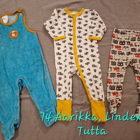 Vauvan vaatteet koossa 74. Lappuhaalari/henkselihaalari, housut, yöhaalarit / yöhaalari.