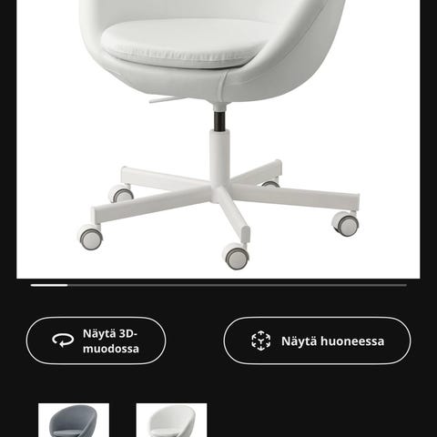 Ikean Skruvsta työtuoli valkoista tekonahkaa. Tuolin mekanismit toimivat moitteetta. Päällinen on ehjä, mutta siihen on käytön myötä tullut pientä tummentumaa.