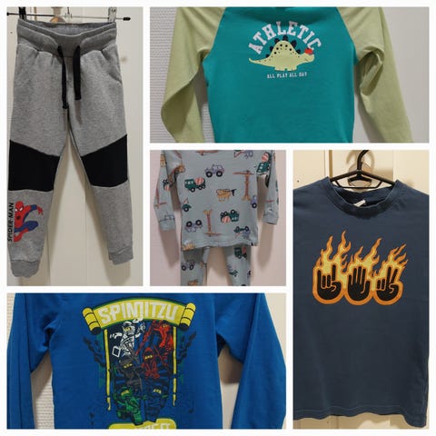 Pojan vaatteet koossa 110. Spiderman pitkät alushousut sekä dinosaurus pyjama.