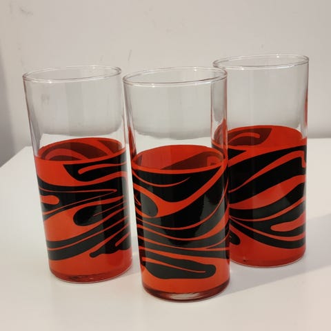Kuvan retro juomalasit 70-luvulta. Kyseessä Poppy juomalasi. Ikäisekseen nähden todella hyvässä kunnossa. Keltaisen väri aavistuksen lämpimämpi luonnossa, kuin kamerassa.