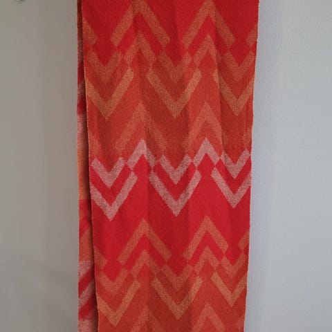 Väreinä lämpimiä viininpunaisen, ruskean ja oranssin sävyjä, parhaiten ne näkyy kuvassa 3. Mielestäni unisex, sopii niin naisille kuin miehillekin. Materiaali 100% villaa.