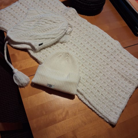 Erilaisia neulottuja asusteita ja talviasusteita. Vähän tai ei ollenkaan käytettyjä.