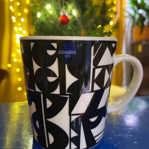 Arabia Timbua 1987 muki, mustavalkoinen kuviollinen design.