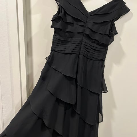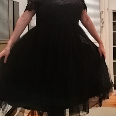 Vero Modan tyllimekko. Koko L. Tylliosa läpinäkyvä, erillinen mekko alle. Voidaan yhdessä tai erikseen. Väri musta, jossa vaaleita kukkia vaaleanpunaisilla lehdillä. Hyväkuntoinen.