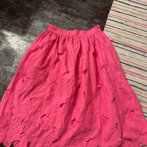 100% puuvillaa ruskea hame, sivulla kolme kirjainta. Vyötäisillä leveä musta resori. Koko M.