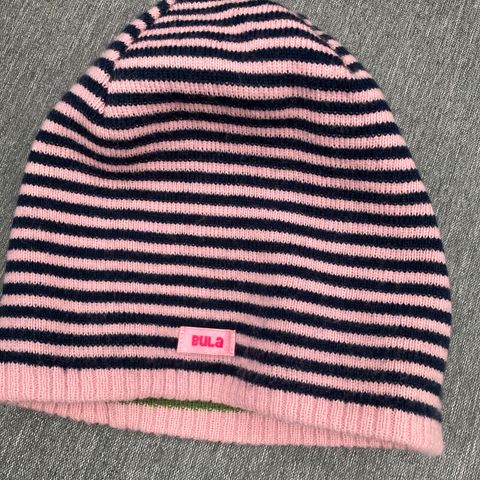 Pörröinen pipo kiristysnauhalla ja puoun korvilla. Pysyy hyvin päässä ja suojaa korvat. Söpö kuin mikä.