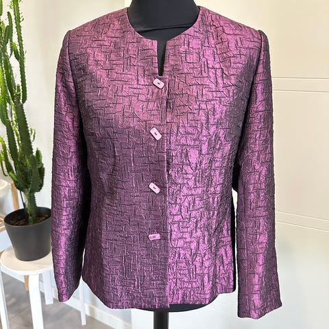 Kaunis lilan värinen, pinnaltaan hieman kiiltävä, siisti juhlajakku. Koko 40. Vetoketjukiinnitys. 64 % polyesteri, 32 % viskoosi, 4 % elastaani.