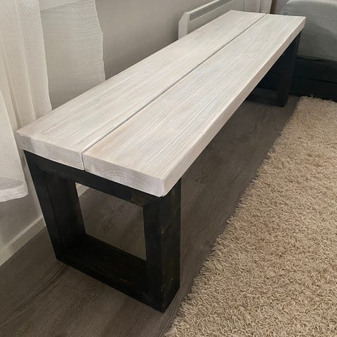 Pitkä penkki, joka on tehty vanhasta 150v. lattialankusta.