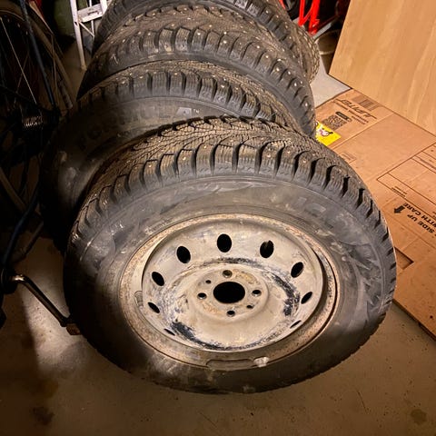 Vanteista pitäisi ruosteet pyyhkäistä pois. Renkaissa kaikki nastat tallessa ja 8-9mm pintaa.