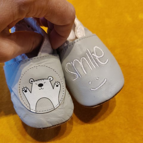 Aidosta nahasta tehty ensiaskel vauvan kengät, ei veny yhtään. Sopii parhaiten koko 18 jalkaan, koska varpaat ei mahdu kunnolla sinne eteen. Saatu lahjaksi, mutta ei ehditty käyttää.