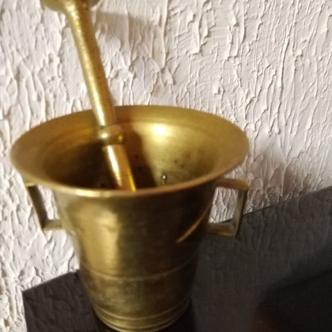 Vanha mortteli, messinki. Korkeus 8 cm, halkaisija 8 cm. Survimen pituus 16 cm. Kunto hyvä, vaatii ehkä kiillotuksen.