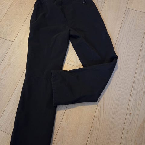 Rukka mustat naisten ulkohousut, koko 36. Housut on suunniteltu ulkokäyttöön ja niissä on vetoketjullinen ja napillinen etuvetoketju. Vyötäröllä on joustava osa ja kiristysmahdollisuus. Materiaalista ja muista teknisistä yksityiskohdista ei ole tietoa.