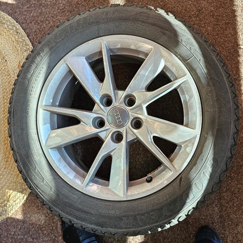 Audi 205/60 R16 et 35 nastarenkaat vanteilla. Renkaiden koko on 205/60 R16, nastoitettu talvirengassarja. Vanteet ovat alumiiniseosta, valmistettu Puolassa.