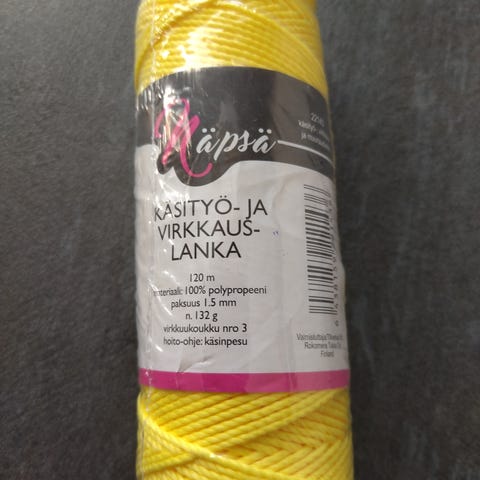 Näpsä käsityölanka, keltainen, sopii erilaiseen käsityöhön. Mukana kolme muovista kirjontakehystä, joissa on kiinnitysklipsit. Kehykset ovat valkoiset ja soveltuvat kirjontaan tai muihin käsityöprojekteihin.