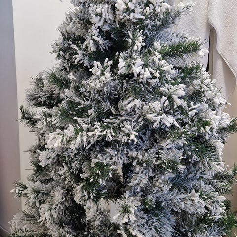 Kotikulta lumihuurre joulukuusi. Laatikossatällä hetkellä.
