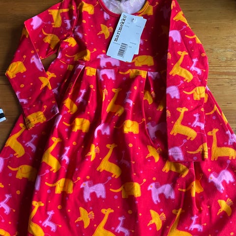 Marimekko/Uniqlon mekko, koko 104 cm, punainen ja sininen väritys, valmistettu puuvillasta. Mekossa on pitkä hiha ja nappikiinnitys edessä. Pehmeä ja menee ainakin 110 kokoiselle. Nouto, mmm.