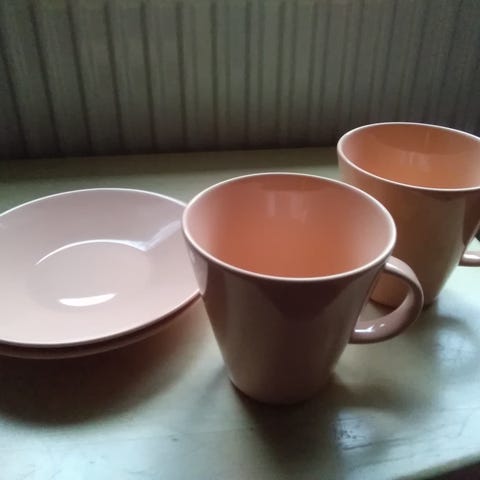Yksi kahvikuppi ja kahvilautanen värissä cantaloupe. Vähän käytetty, puhdas ja siisti kunto. Kupissa ei lainkaan lusikanjälkiä eikä selvästi havaittavia naarmuja, lautasessa on hyvin vähäistä käytön jälkeä, ei kuitenkaan syviä naarmuja. 15e yhdessä