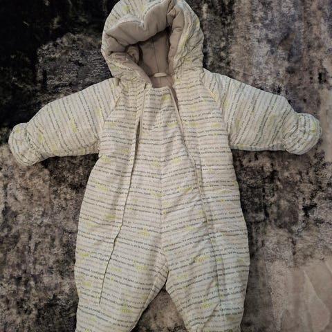 Siistikuntoinen toppahaalari ja mukaan töppöset ja tumput. Töppösissä muutama tahra näkyy kuvissa.