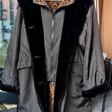 Ruskea/beige leopardikuvioinen lämmin toppatakki.Pierre Cavallo.