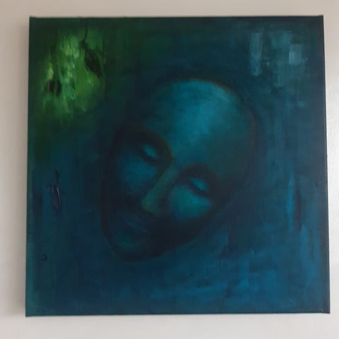 Uniikki teos katseesta. Teoksen koko 50*50*4cm. Väreinä turkoosi, sininen, sekaväri. Tekijä KK 2025