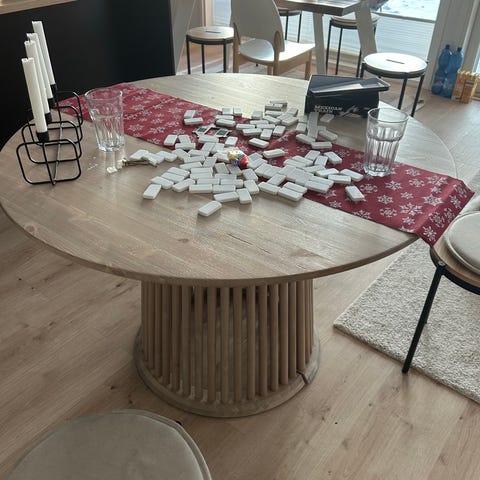 Pyöreä ruokapöytä, joissa vaalea viimeistely. Pöytä sopii 8 hengen ruokailuun. Materiaalina tammi, väri vaalea luonnon sävy.