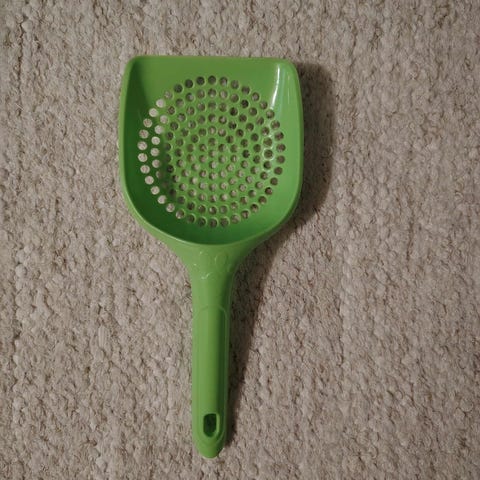 Muovinen uusi kissanhiekka lapio, väriltään vaaleansininen. Soveltuu kissanhiekan siivoamiseen ja on varustettu rei'itetyllä kauhalla hiekan erottamiseksi.