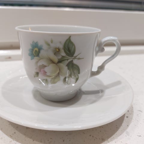 Tämä valmistaja tunnetaan laadukkaasta posliinistaan, ja erityisesti 1950–1960-luvuilla vaalean pastellisävyisestä lehtikuviost. Kuvassa näkyvä kruunumerkki on tyypillinen heidän tuotemerkilleen tuolta ajalta."