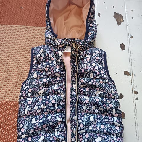 H&M Kirjava lasten liivi, koko 68, tytöille. Liivissä on kukkakuvioinen kuosi ja vetoketjukiinnitys. Sisäpuoli on pehmeää ja lämpöä eristävää materiaalia.