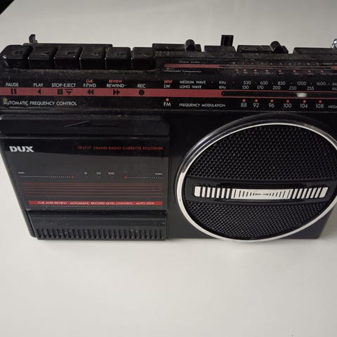 Radio kuuluu ja kasettipuoli pyörii. Laite nähtävänä Harskan huutokauppamyymälässä Jyväskylässä. Runkotie 2. Myymälässä aitonahkaisia talvikäsineitä 5 €/ pari