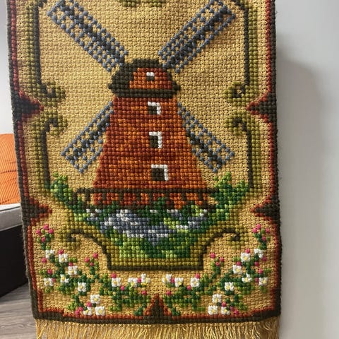 Vanha, hyväkuntoinen pienillä pistoilla tehty Tuhkimo- aiheinen ristipistotyö.