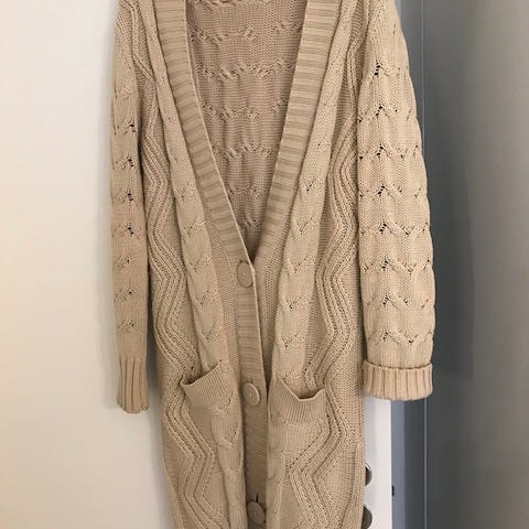 Beige Vero Moda pitkän mallinen neuletakki. Nappien alapuolelta takki on avonainen. Koko S. Pehmeetä materiaalia, materiaali lappu leikattu pois. Hyväkuntoinen ja siisti, en löydä mitään jälkiä. Vähänkäytetty.