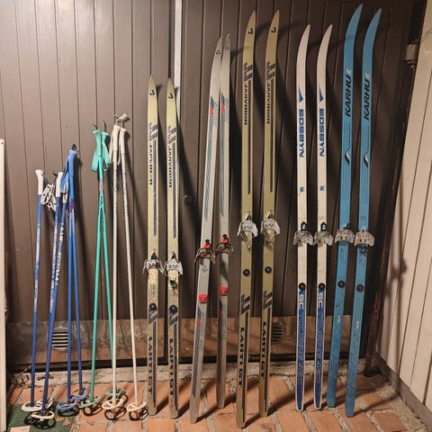 Annetaan pikkulapsen muovikärkiset sauvat. Sommat rikki, mutta kyllä näillä vielä hiihtoa harjoittelee.