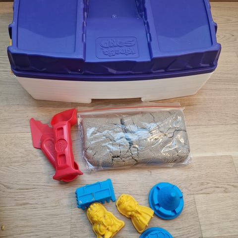 Sisältää: 4 eri väristä hiekkaa, 2 puristinta, 3 työkalua ja pizza-laatikon