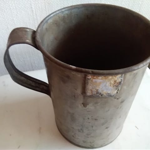 1 litran ja 0,5 litran vanhat mitat. Vuosikymmenten käytön mittaan kuluneet, mutta ehjät. Ison korkeus 13,5 cm, pienen 9,5 cm. Yhteishinta 15 e.