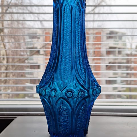 Sininen vintage maljakko. Handkerchief- ja Muranotyylinen. Korkeus noin 25cm korkeimmalta kohdalta. Muutamia naarmuja ja jälkiä pinnassa, näkyvät kuvissa.