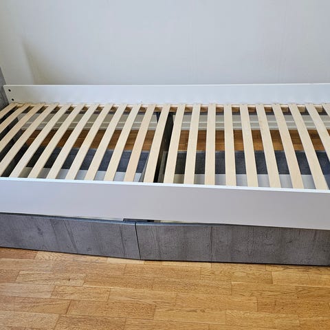 Hyväkuntoinen harmaa lisävuode. Annetaan ilman patjaa, mutta vuoteeseen sopii 90x200 kokoinen patja.