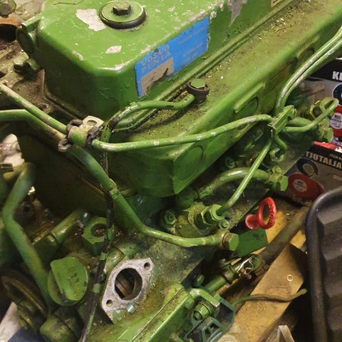 Volvo Penta MD11C noottorilohkossa kiinni oleva mm. nokka-akselin käyttökoneiston kansi sekä siihen liittyvä MS-kytkimen kiinnityslaippa.