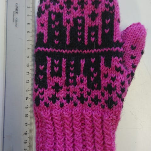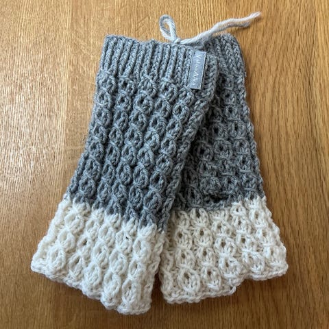 Naisten käsin kudottu panta ja kynsikkäät. Lankana Seitsemän veljestä (75 % villaa ja 25 % polyamidia). Yhteensä 35 €, erikseen 20 €/kpl.