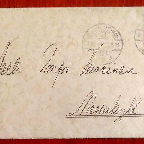 Kirjekuori vuodelta 1915. Kunto kohtalainen. Koko 14,5x11cm. Ei sisältöä.