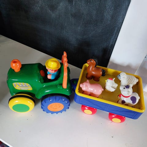 Fisher-Price traktori ja peräkärry. Ajaessa kuljettaja liikkuu ylös, alas ja peräkärrissä tavara liikkuu.