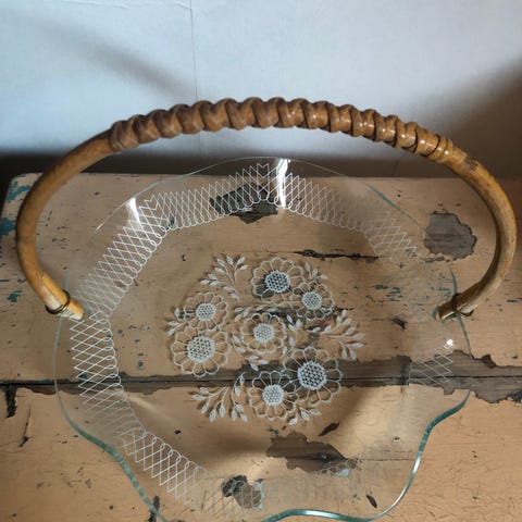 Myydään upea, vanha lasinen kakkuvati, jossa on näyttävä tähtikuvioinen (starburst) kuviointi. Puristelasista valmistettu vati henkii menneen ajan tunnelmaa ja sopii täydellisesti niin kakkujen, pikkuleipien kuin muiden herkkujen tarjoiluun.