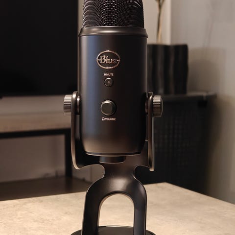 Blue Yeti USB-mikrofoni harmaa väriltään. Sisältää säädettävän mikrofonivarren, joka mahdollistaa joustavan sijoittelun. Mikrofonia voidaan käyttää tietokoneen kanssa esimerkiksi äänitykseen, podcastien tekemiseen tai pelaamiseen.