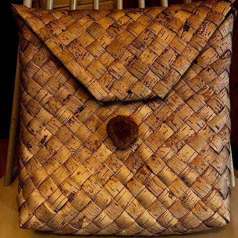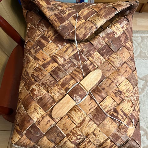 Tuohikontti, perinteinen koivun tuohesta punottu reppu. Nouto Nummelta tai Helsingistä (Ruoholahti).