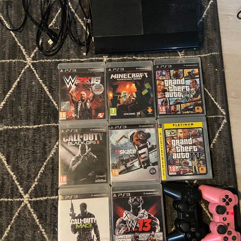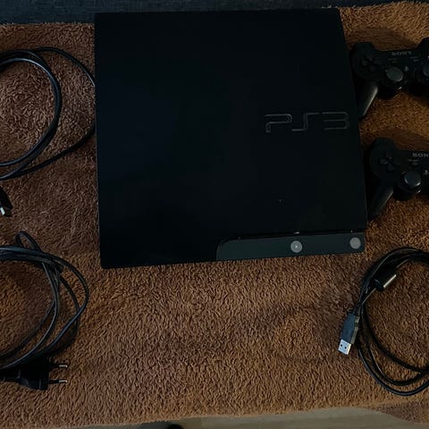 Sony PlayStation 3 pelikonsoli musta väri. Mukana useita pelejä, ohjain, mikrofonit ja liitäntäkaapelit. Konsoli soveltuu kotikäyttöön erilaisiin videopeleihin. Ps3 on kyllä vähän pölyinen
