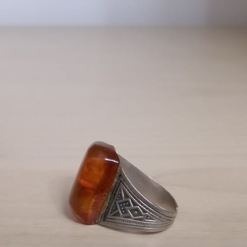 Uniikki meripihkasormus käsityötä. Hopealeimoja ei ole mutta vaikuttaa siltä ja kaunis patina.