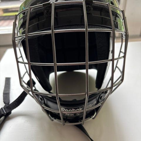 Reebok FM 5K jääkiekko kypärä, koko L, musta väri. Kypärä on varustettu metallisella kasvovisiirillä ja on HECC-sertifioitu, mikä takaa turvallisuusstandardien täyttymisen