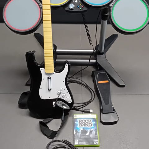 Guitar hero XBOX 360 -setti. Sis. kaikki kuvassa: rummut, rumpukapulat, jalkapedaali, mikrofoni, kitara (tuunattu tottakai tarroilla 😎), käyttöohjeet ja kaksi peliä. Pelit World Tour ja Band Hero. Siisti setti, jossa asianmukaista kulumaa rumpukapuloista