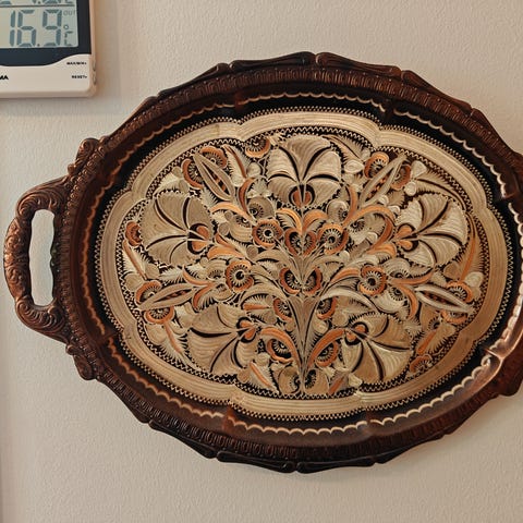 Kuparinen koristeellinen seinälautanen ruusukuvio